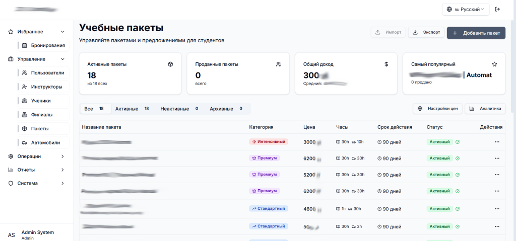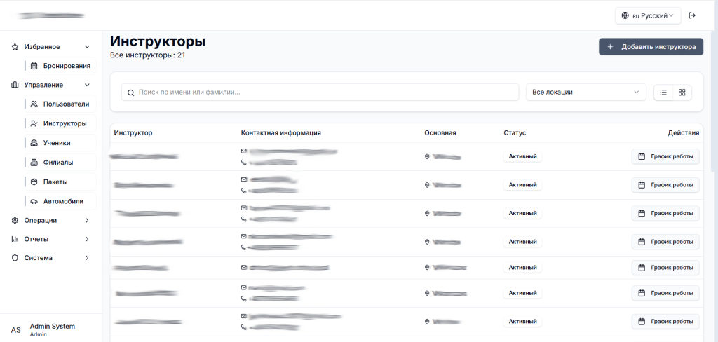 • Управление расписанием, инструкторами, учениками и автопарком.