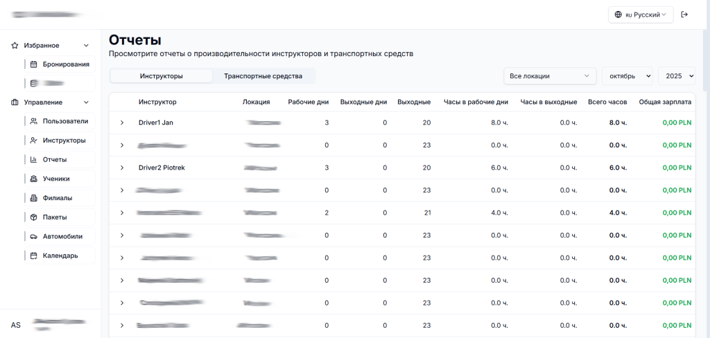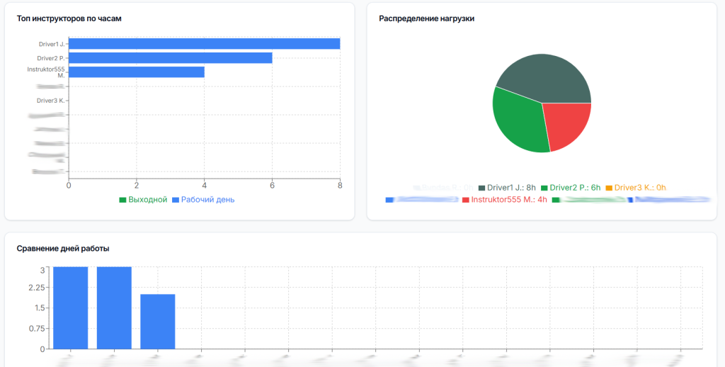 • Оптимизация нагрузки на инструкторов и отслеживание рабочего времени.