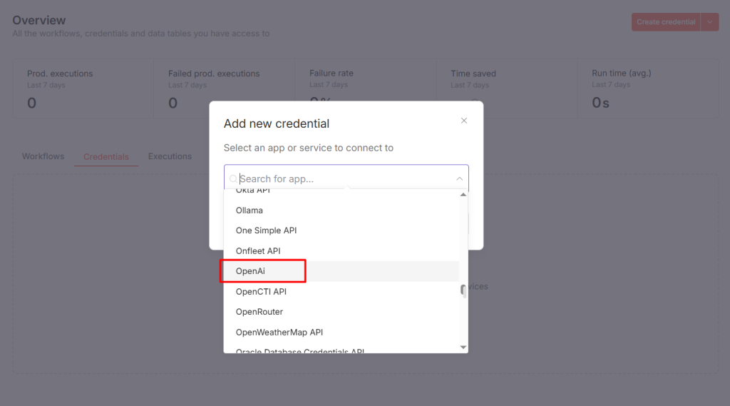3. Выберите OpenAI API (или OpenAI / OpenAI (Chat Models) в зависимости от версии n8n).