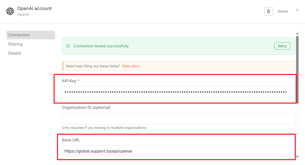 n8n поддерживает OpenAI «из коробки», но по умолчанию использует оригинальные endpoints. Для использования API Support.by нужно указать свои адреса.