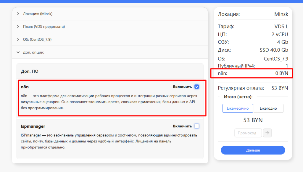 При заказе виртуальных серверов VDS/VPS в Support.by вы можете включить опцию установки n8n.